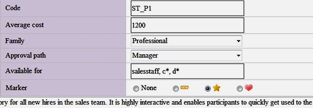 All existing courses are listed in a repository with full details. Courses can be searched, filtered and sorted by levels, families, duration or costs. Administrators can set that users can see the courses they are entitled to, depending of their grade or experience inside the organisation.