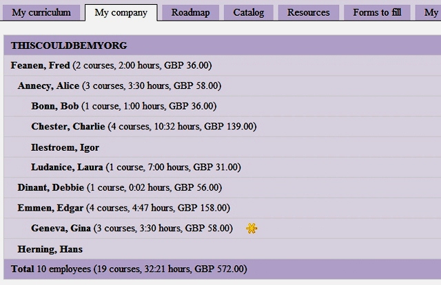 Every user on the site can have a curriculum which is a list of courses that have already been taken, are scheduled or need to be taken. The curriculum acts as a development path and lists the number of courses, hours and amounts invested in training every year.