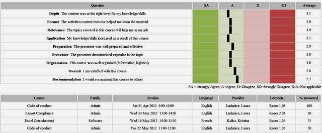 When a session is closed, coordinators can request from participants to fill an on-line a training quality satisfaction survey (Kirkpatrick level 1) with 9 simple questions. Feedback request can be made mandatory to fill. Coordinators can track answer percentage rate and automate requests for missing feedback.