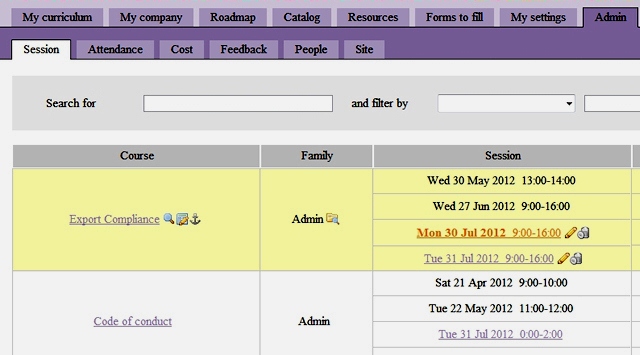 Navigation flows freely throughout the site thanks to a simple tabbed interface where all options are always visible and immediately accessible. Subtle highlighting and small icons next to items like courses, sessions or people show all actions that users are allowed to do like viewing, editing or registering.