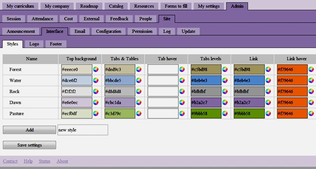 Site administrators can create either a unique 'corporate' or several free themes which mix colors, fonts and sizes. User can then select freely the style they would like to work with. Interface customisation includes the company, group, association logo and free editable footers.