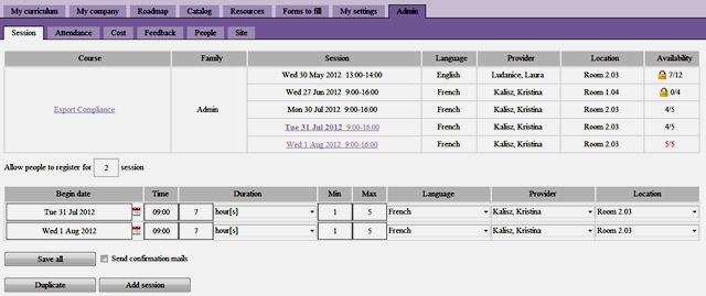 Courses can have one or more sessions: they all have a start date and a duration expressed in minutes, hours, half-days, sessions or days. Each session has a minimal and maximal number of participants, a trainer/teacher, a location and a delivery language.