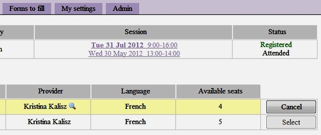 Users can select a session which sets the day and time of a particular course. All it takes are 2 clicks: select the course, then select any available session. Email confirmations are sent automatically, they include all the courses details and a special ics file which can update Outlook or iCal agenda.