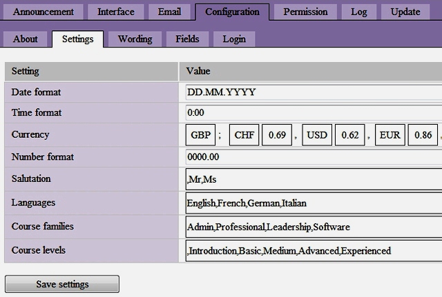 Site administrator can define a series of site-wide settings, like date and time format, currency label, languages in which session can be delivered, family of courses and level of courses, for example basic or beginner.