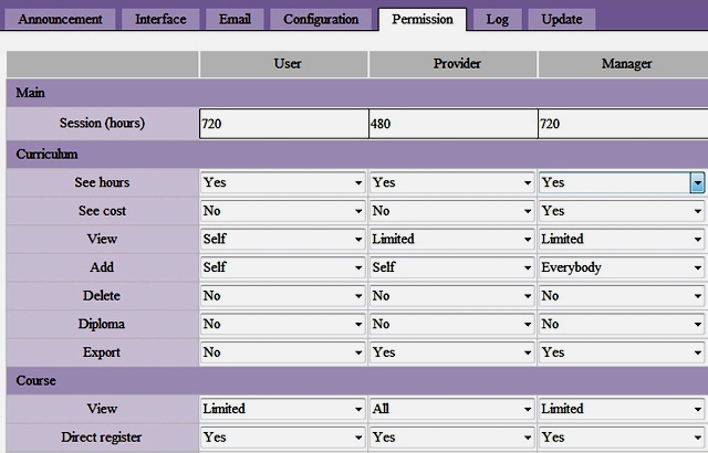 There are about 40 different settings that each role can have and which can be freely set by the site administrator. For example, user cannot see costs, but supervisors can; coordinators can create sessions but trainers cannot. This enables a total control over the site and information access.